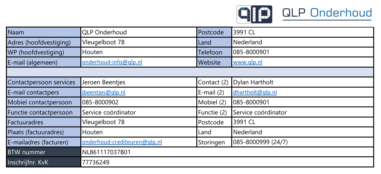 - Wij vragen u om onze bedrijfsgegevens vanaf 1 januari 2026 aan te passen naar QLP Onderhoud B.V. Zie onderstaande gegevens.
